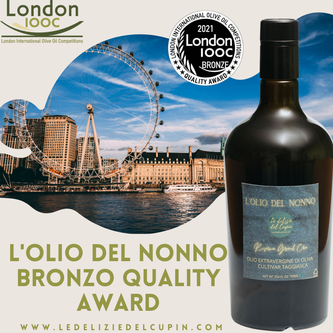 L'olio del Nonno ha ottenuto la medaglia di Bronzo al Concorso Internazionali di Olio Evo Extravergine di Oliva disputatosi a Londra 2021.